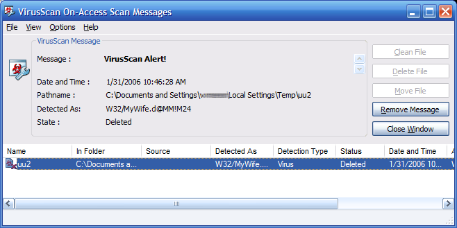 Then on a whim, I decided to extract the file onto my desktop! I know Master, I was being capricious and indiscreet, but I reasoned, extraction never executes the file, so went ahead with the extraction! Thankfully, my anti-virus was updated, and On-access Scan was enabled, due to which my actions were condoned! And, that’s how I received a visit from “MyWife.d”!