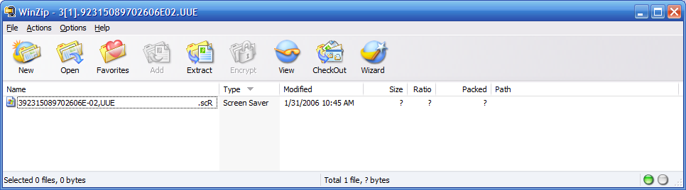 So, I saved the attachment to my disk, and opened it in Notepad and well, it was indeed a UUE, and not just a renamed executable type! I opened it in Winzip and the default Winzip window showed the attachment contained another UUE (note, instead of a ”.UUE’, it was a “,UUE” — a giveaway that there’s something fishy!) I maximized the name column, and saw that the extension was actually “.scr!” So, to catch an uneducated user unawares (I like that alliteration :D ) the file name was modified!